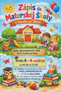 Milí rodičia, oznamujeme vám, že zápis detí do Materskej školy v Ivanke pri Nitre sa uskutoční v termíne 4. – 6. mája 2026 v čase od 10:30 do 12:30 hod.